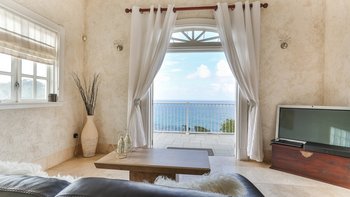 In der Hütte gibt es einen geräumigen Bereich, bestehend aus einer Küche mit Frühstückstheke, einer Sitzecke und einem Schlafzimmer mit Doppelbett mit Balkon und Meerblick und Bad en suite.