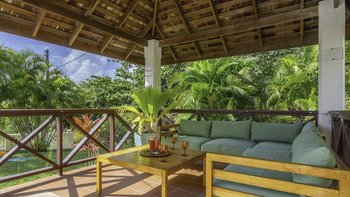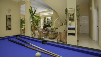 Der Panoramablick von der Terrasse im Erdgeschoss ist fantastisch – mit Blick auf das Meer und den benachbarten 18-Loch-Championship-Golfplatz gibt es einen Esstisch und bequeme Sitzgelegenheiten im Freien, die die Aussicht genießen, ideal für Abendessen im Freien oder Cocktails bei Sonnenuntergang. Im Inneren ist das Erdgeschoss hell und offener Grundriss und vereint einen weiteren Essbereich, eine gut ausgestattete Küche und ein geräumiges Wohnzimmer mit einer schönen Gewölbedecke und großen Fenstertüren, die zur Terrasse führen. Der Rest des ersten Stocks besteht aus einem Super-Kingsize-Schlafzimmer mit begehbarem Kleiderschrank und einem zusätzlichen Schlafzimmer mit Doppelbett und eigenem Bad. Das Hauptschlafzimmer öffnet sich zu einem Julia-Balkon und das zweite Doppelschlafzimmer öffnet sich zur vorderen Terrasse. Gehen Sie die Treppe hinunter in das untere Erdgeschoss und es gibt einen weiteren geräumigen, hellen Essbereich mit einem wunderschönen, durch einen Ventilator gekühlten offenen Raum für absolute Entspannung. Ein brandneues Spielzimmer bringt den ganzen Familienspaß, mit einem großzügigen 7ft Billardtisch und Airhockey – ein Mini-Basketballfeld steht ebenfalls außen zur Verfügung. Es gibt drei weitere große Schlafzimmer im unteren Erdgeschoss – ein Doppelschlafzimmer mit Bad en Suite und Kingsize- und Doppel-Sharing mit Zugang zu einem separaten Duschbad. Dessen untere Erdgeschoss hat direkten Zugang zum Poolbereich durch die Terrassentüren des Wohnzimmers. Ein weiterer Esstisch im Freien bietet Platz für 6 Gäste, und es gibt einen Privater Pool, Liegestühle auf der Terrasse, einen schattigen Pavillon mit bequemen Sofas und herrlichen Kokospalmen, die über das Grundstück verstreut sind.