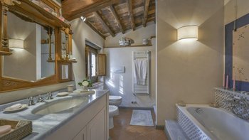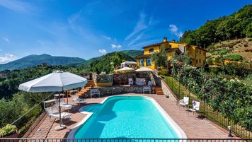 Abgeschieden auf dem Land, nur 1,5 km von den Geschäften und Restaurants in Casalguidi und 11 km von allen Annehmlichkeiten des historischen Pistoia entfernt, ist dieses hübsche gelbe Haus mit atemberaubendem Panoramablick von Anfang an beeindruckend. Umgeben von Olivenhainen, Obstbäumen und zarten Rosengärten ist dies ein Rückzugsort, der für absolute Privatsphäre geschaffen wurde. Der große Swimmingpool im Freien lädt mit Liegestühlen, möblierten Terrassen und übergroßen Sonnenschirmen zu entspannten Tagen ein, während die Villa im klassischen Country-Chic-Chic verwöhnt wird. Durch die geräumige Haupteingangshalle ist die große offene Lounge eine Oase der Entspannung, die mit Sofas für Waschbecken und aufwendig gemusterten Teppichen ausgestattet ist. Sowohl einfach als auch raffiniert, einige der auffälligen Möbel des Raumes umfassen ein altes Holzpiano und den auffälligen Eckkamin. Durch das Wohnzimmer hat ein angrenzender Essbereich Glasschiebetüren, die auf eine charmante Terrasse mit herrlichem Blick auf die Landschaft führen. Weiters geht es in die geräumige High-Spec-Küche – ausgestattet mit allen notwendigen Annehmlichkeiten – und es gibt eine zweite gemütliche Sitzecke mit Sesseln und einem kleineren Kamin. Nach dem gleichen rustikal-chic Stil hat jedes der Schlafzimmer ein einfaches Design mit subtilen pastellfarbenen Wänden und Holzbalkendecken. Den Schlafzimmern und Sitzzimmern im Erdgeschoss und im ersten und ersten Stock ist das Layout ideal für zwei Familien.