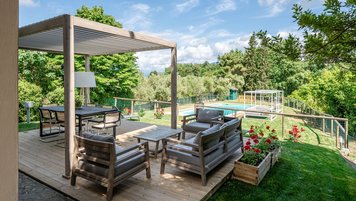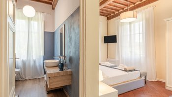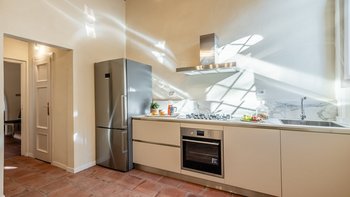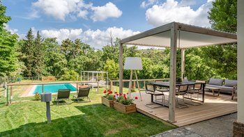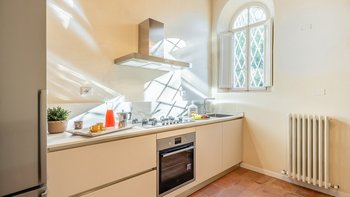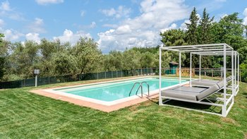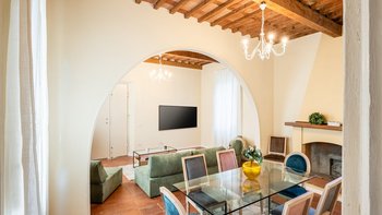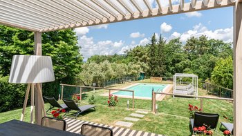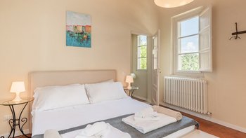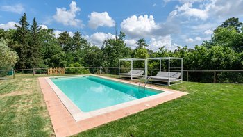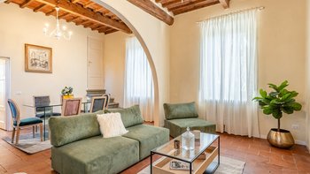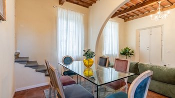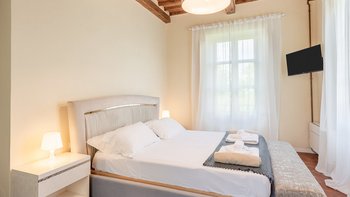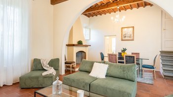 In der Villa sind der offene Grundriss des Wohnbereichs und des Esszimmers perfekt miteinander verbunden, um einen einladenden Raum zu schaffen, in dem die Gäste zusammenkommen und lokale Küchen genießen können, während natürliches Licht frei von Raum zu Raum fließt und den Raum beherrscht. Der Wohnbereich führt auf den Patio und bietet direkten Zugang zum Garten und zum Pool. Deren Küche ist mit einer Frühstückstheke ausgestattet, so dass Sie schnell und bequem essen können, wann immer es Ihnen passt. Beiden Schlafzimmer im Obergeschoss haben ein eigenes farbenfrohes Bad. Der Balkon des Hauptschlafzimmers bietet einen Blick auf den Pool und den Garten – der perfekte Ort für einen erhöhten Blick auf die ländliche Toskana. Deren andere Schlafzimmer verfügt über eine Terrasse mit Tisch, Stühlen und ein paar Liegestühlen für erholsame Tage in der Sonne.