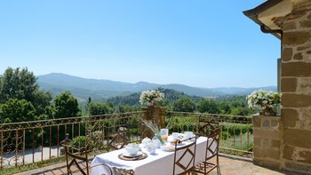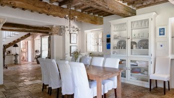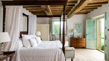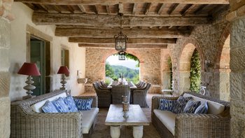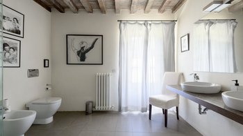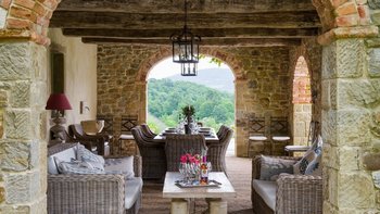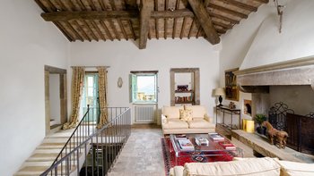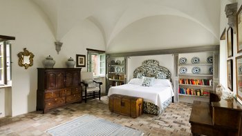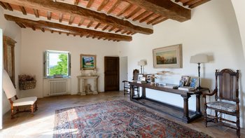 In den Hügeln zwischen Cortona und Mercatale gelegen, befindet sich dieses imposante alte Herrenhaus in ruhiger Abgeschiedenheit und ist dennoch gut gelegen, um sowohl toskanische und auch umbrische Städte zu erkunden. Dessen wunderschön restaurierten Dachsparren, Eichendecken und Steinstürze der Villa stehen heute neben modernen Geräten, modernem Komfort und faszinierenden Artefakten in mit schlichter Eleganz eingerichteten Zimmern. Im Herzen des Hauses befindet sich ein charmanter Salon in frischem Blau und Weißen, ergänzt durch einen gemütlichen Fernsehraum, ein Arbeitszimmer im ersten Stock und ein Wohnzimmer mit Galerie. Das Maniero di Sorbello besticht durch seine Innenausstattung mit Stoffen aus Chelsea Textiles, Percheron und Claremonte sowie Möbeln aus aller Welt. Es ist reich an Kultur, italienischen Elementen, einem gustavianischen Bücherregal aus dem 18. Jahrhundert und römischen Antiquitäten.