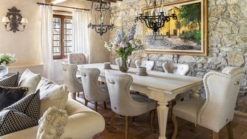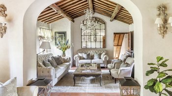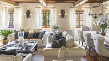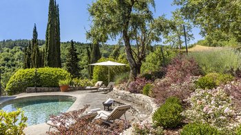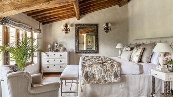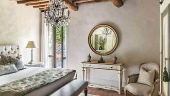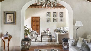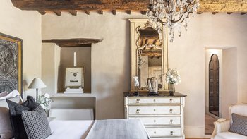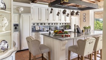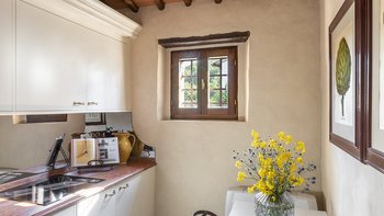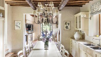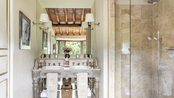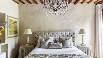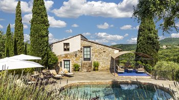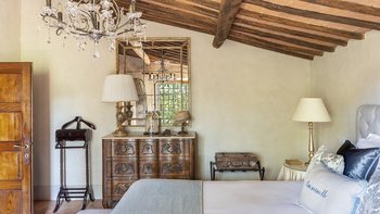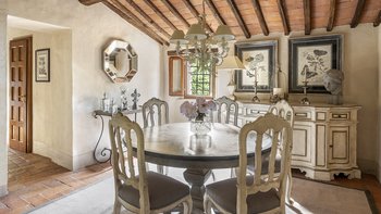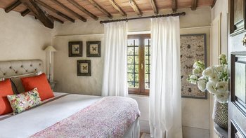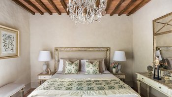 Diese Immobilie verfügt sowohl innen und auch außen über eine hohe Ausstattung. Deren wunderschöne Steinfassade ist traditionell klassisch und fügt sich perfekt in den abgerundeten, versunkenen Pool im hinteren Teil ein – es ist ein sofortiger Blickfang, der wunderschön mit gusseisernen Liegen und einer großzügigen, grauen Steinterrasse eingerahmt ist. Es gibt viel Platz für ein Sonnenbad oder eine Pause, sowie zwei große Terrassen mit Pergolen mit Travertin-Marmor-Tischen für ein gemütliches Frühstück, lange Mittagessen oder warmes Abendessen im Freien. Ins Innere ist die Villa sehr stilvoll, mit einer Eleganz, die rustikale Raffinesse schreit. Die geschliffenen cremefarbenen Wände der Alten Welt werden durch üppige Holzakzente ergänzt, seien es die schönen Balkendecken, dunklen Holzfensterscheiben oder die handgeschnitzten Möbel, die für das Anwesen maßgeschneidert sind. Es erwarten Sie antike Spiegel, florentinische handbemalte Schränke und handgeschmiedete Kronleuchterbeleuchtung in jedem Zimmer – es gibt auch schöne authentische Artefakte und Terrakotta-Fliesenböden, die dem Landhausdesign einen traditionellen Luxus verleihen. Deren Lounge ist wunderschön, mit Plüschsofas und einem großen Fernseher für maximalen Komfort, und es gibt eine maßgeschneiderte toskanische Küche, die einen herrlichen Rahmen für einen Aufenthalt in den Mahlzeiten bietet. Deren Villa verfügt über sieben Schlafzimmer – die Hauptvilla bietet Platz für 10 Personen, während weitere 4 im Kornspeicher am Pool untergebracht werden können. Alle Zimmer sind elegant in look and feel – luxuriöse Betten verbinden sich mit einem modernen Bad, das in traditionellem toskanischem Marmor eingerichtet ist.