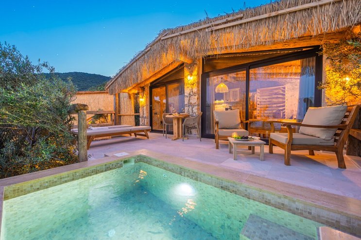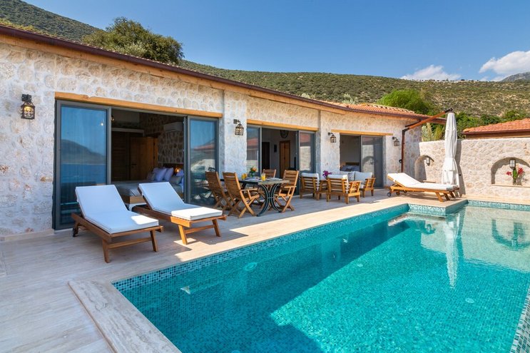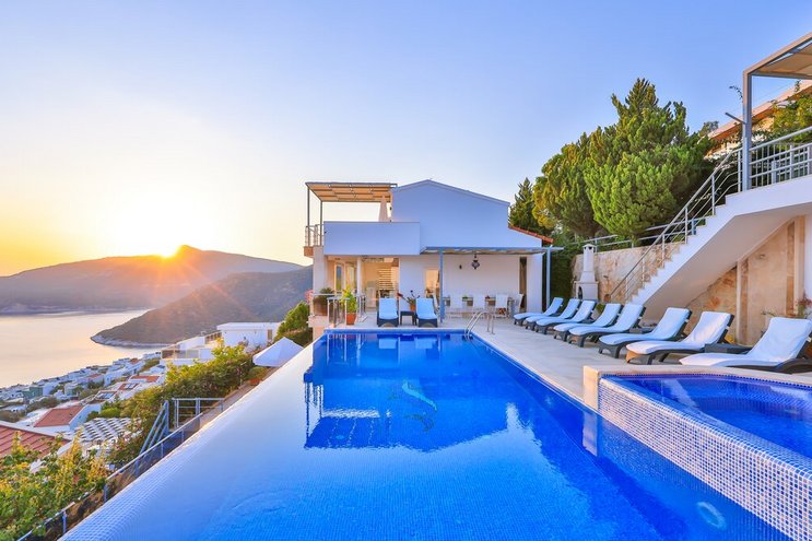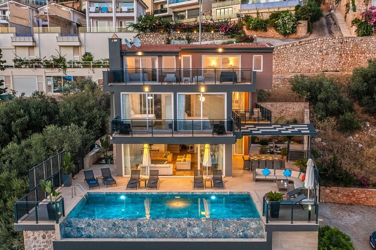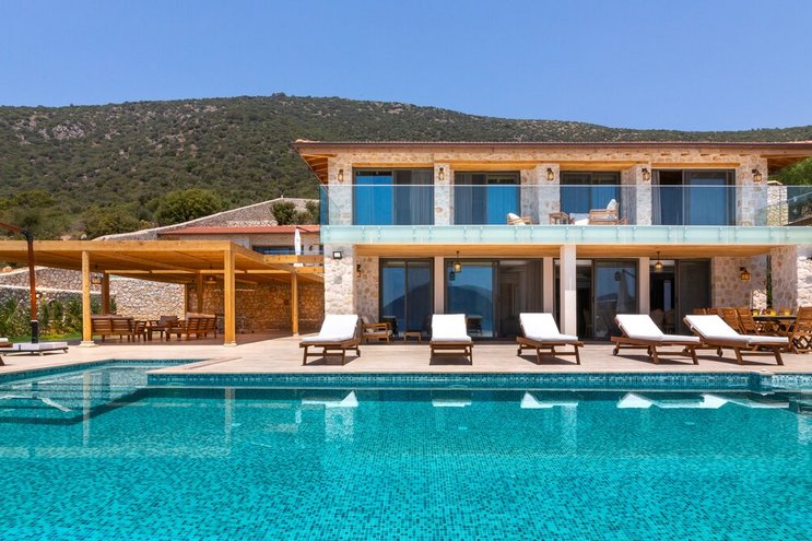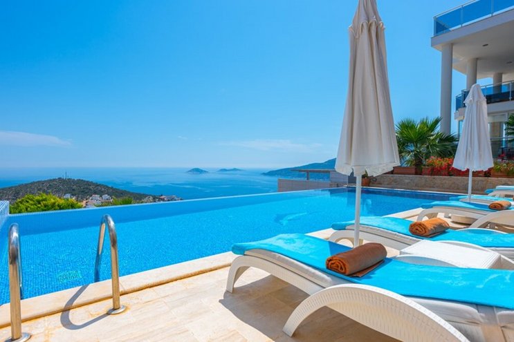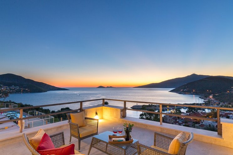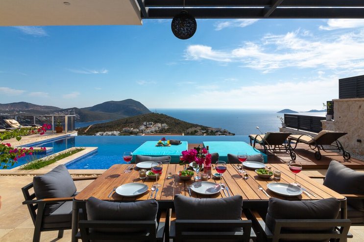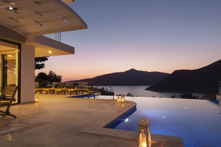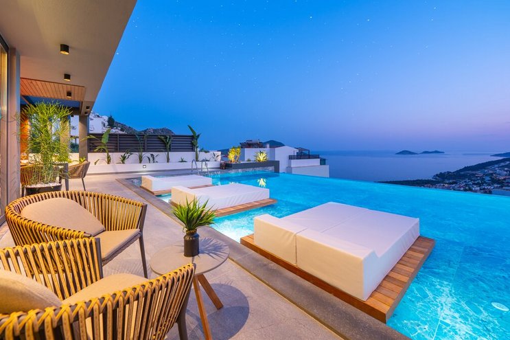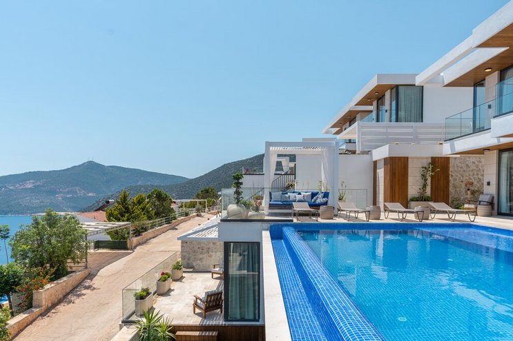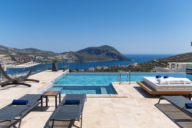 Villa Akim I ist stilvoll und anspruchsvoll mit einem Infinity-Pool und direktem Strandzugang – der perfekte Ort für Paare, die in Kalkan Urlaub machen.