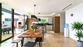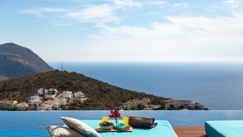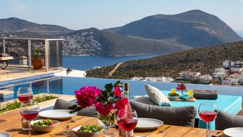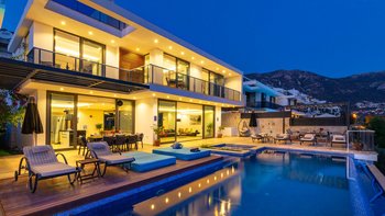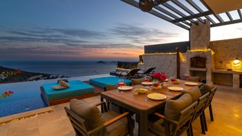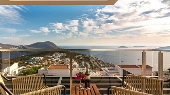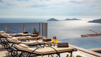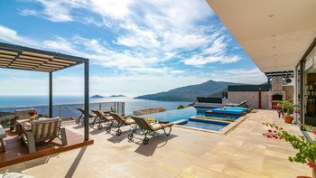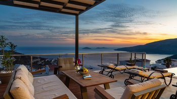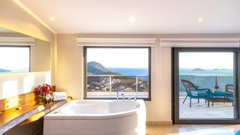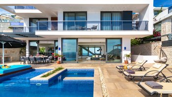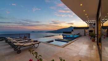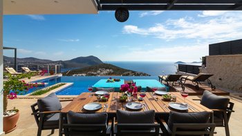 Im Freien können die Gäste warme Abende auf der Terrasse verbringen, die mit einem Essbereich im Freien, Privat Pool, Lounge-Bereich und Tagesbetten über dem Wasser ausgestattet ist. Deren Villa befindet sich nur 25 Minuten zu Fuß oder zwei Minuten mit dem Auto von Kalkan entfernt, wo es viele Restaurants, Geschäfte und Cafés gibt. Die Strandclubs Zest und Kalamar befinden sich beide weniger als 3 km entfernt.