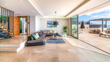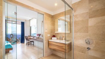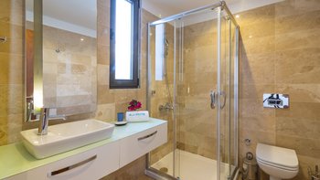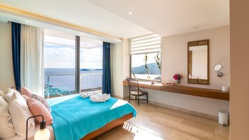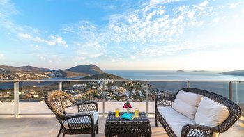 Auf einem Hügel mit atemberaubendem Blick über das Meer gelegen, ist die Villa Ayaz eine moderne Villa mit vier Schlafzimmern mit eigenem Bad und einem Fitnessraum.