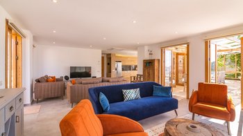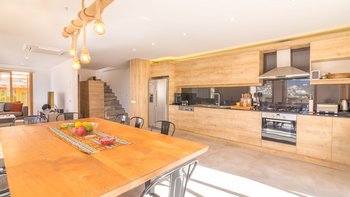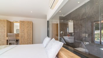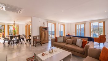 Die Villa im Inneren ist mit hochwertigen Antiquitäten und Kunstwerken eingerichtet und besteht aus dem 2-stöckigen Hauptgebäude und den 3 Etagen des angrenzenden zweiten Hauses. Im Mittelpunkt des Haupthauses steht eine wunderbar OFFENER GRUNDRISS Küche und ein Essbereich. Sehr modern im Stil, mit eleganten Holzmöbeln, einem großen Kühlschrank mit Gefrierfach und einer Kaffeemaschine, führt das Zimmer um die Ecke zum farbenfrohen Wohnzimmer – es gibt viel Platz für das Sofa zum Entspannen am Abend und einfachen Zugang zur Poolterrasse im Freien. Eine Treppe führt hinauf zu einem wunderschönen Schlafzimmer mit Doppelbett – ein skurriles Bad mit Glasfenstern und verstellbarem Sichtschutz, verfügt über eine großzügige ebenerdige Dusche und riesige Türen führen zu zwei schönen Sonnenterrassen mit Blick auf die Bucht und Kalkan. Im zweiten Gebäude befinden sich die weiteren drei Schlafzimmer – ein Schlafzimmer mit Doppelbett und ein Zweibettzimmer, beide mit eigenem Bad im Erdgeschoss, zusammen mit einer kleinen Küchenzeile für zusätzlichen Komfort und Privatsphäre. Ein weiteres Schlafzimmer mit Doppelbett mit eigenem Duschbad (ähnlich dem im Hauptgebäude) vervollständigt die erste Etage, während ein Spielzimmer mit Tischtennisplatte und klimatisiertem Fitnessbereich die untere Ebene des Gebäudes bildet.