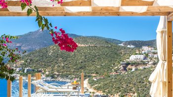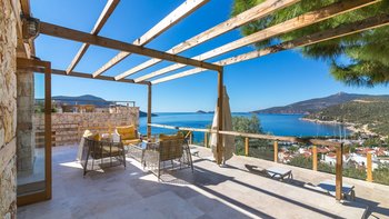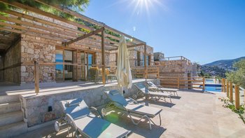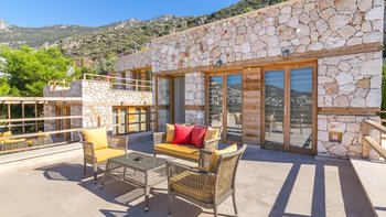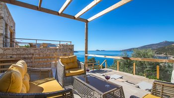 Sehr geräumige Sonnenterrassen genießen einen ungestörten Blick auf das Mittelmeer in diesem eleganten Steinhaus am Rande der charmanten Altstadt von Kalkan.