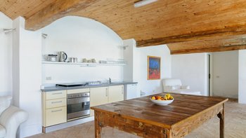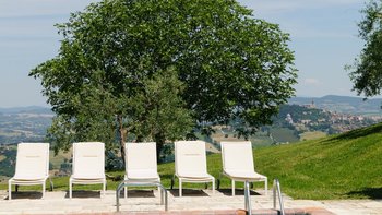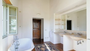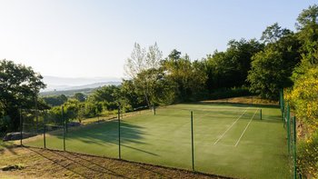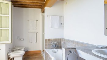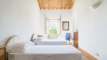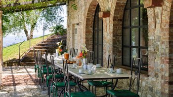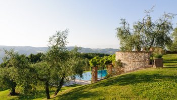 Sogar von der sehr traditionellen Steinfassade aus sieht dieses Haus eher wie eine Landvilla aus als ein weitläufiges Gehöft, aber dennoch überrascht das helle und geräumige Interieur. Denen alte Welt trifft auf das neue in einem langen Wohnzimmer mit seiner gerippten Terrakotta-Decke über klaren weißen Wänden und großen modernen Sofas, einem großen Steinkamin an einem Ende und den klaren Linien einer modernen Essecke am anderen Ende. Es gibt allen Komfort unter dem Dachsparren, das Arbeitszimmer ist mit WLAN und iPod-Dockingstation ausgestattet und die Schlafzimmer sind übersichtlich und dezent. Draußen bietet ein langer Marmortisch die große Terrasse an lauen Abenden bei Kerzenschein und zwei Treppen führen hinunter zum Infinity-Pool, wo ein großes Poolhaus mit eigener Küchenzeile eine mit Glyzinien überzogene Terrasse für Mittagessen im Freien serviert. Des 4 Hektar große Grundstück umfasst versilberte Olivenhaine und fällt sanft hinunter zu einem Tennisplatz ab (gemeinsam mit der Schwestervilla Casa Andrea). Ein Kochservice könnte hier ein zusätzlicher Genuss sein, und es gibt ein ausgezeichnetes Restaurant nur eine kurze Autofahrt entfernt. Dessen sehr ruhige Lage ist nur 8 km von Geschäften und Restaurants im schönen Todi entfernt, dessen Skyline von der Villa aus sichtbar ist.