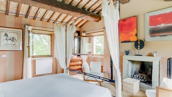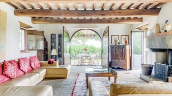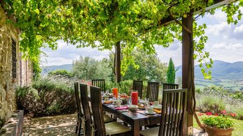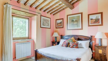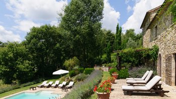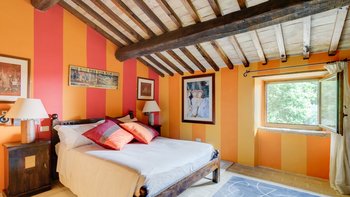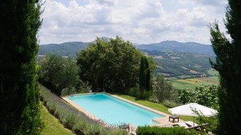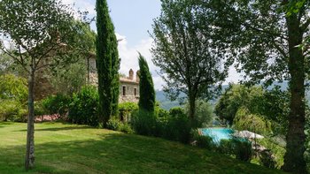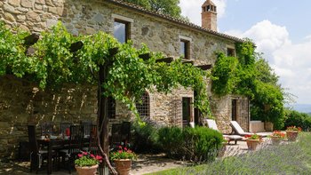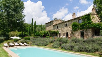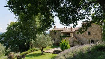 Mit ihren weitläufigen Rasenflächen, die von Rosmarin- und Lavendelschwaden getrennt sind, ist diese ehemalige Olivenmühle heute eine wunderbar einladende Villa in den unberührten Hügeln Umbriens an der toskanischen Grenze, in der Nähe von Restaurants und Weinproben.
