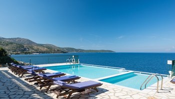 Diese Familienvilla auf Korfu liegt direkt an der felsigen Küste und bietet geräumige Terrassen, von denen Sie die herrliche Aussicht genießen können. Sie ist nur einen kurzen Spaziergang von einer Reihe von Stränden und Kassiopis Geschäften und Cafés entfernt.