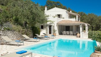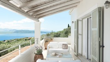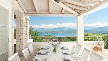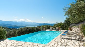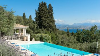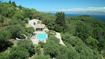 Eine idyllische kleine Enklave, mit inspirierendem Blick auf die umliegenden Hügel, Küstenbuchten und Albaniens Berge, ist dies eine sehr moderne Luxusvilla auf Korfu, wo Ruhe fast greifbar ist.