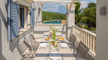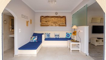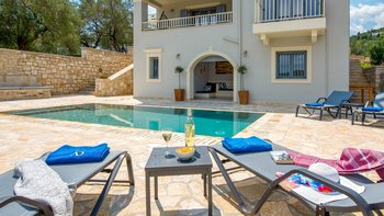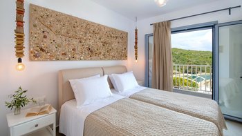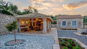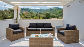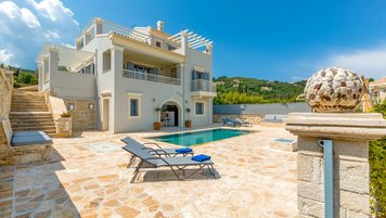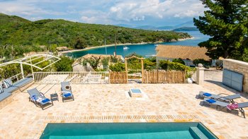 Pythaia genießt eine herrliche Hanglage und ist nur 300 m vom Hafen von St. Stephano entfernt, dem Herz des Dorfes mit Restaurants, Bars und Geschäften am Wasser und 400 M vom Strand entfernt. St. Stephano verkörpert entspanntes Leben auf Korfu und die schönen Terrassen von Pythaia bieten einen Blick auf die belebte Uferpromenade im Zentrum des Dorflebens. Trotz der Nähe zum Dorf bietet Pythaia viel Platz im Freien. Dessen Highlight ist der schöne Pool auf der sonnigen unteren Terrasse und das angrenzende Poolhaus mit eingebautem Sitzbereich und separatem Fernsehraum mit PlayStation, einem idealen Rückzugsort für ältere Kinder. Einige Stufen hinauf, hat die Terrasse rund um das Haupthaus einen im Freien eingebauten Frühstückstisch für 6 Personen mit Meerblick über St. Stephano und dahinter eine Sommerküche, eingebauter Grill und zweiter Essplatz auf der Rückseite des Hauses. Im Erdgeschoss der Villa befindet sich ein offenes Grundriss Wohnzimmer und eine moderne Küche mit Türen, die zur Seitenterrasse mit Frühstückstisch und nach vorne, einem großen Balkon mit Meerblick führen. Ebenfalls im Erdgeschoss befindet sich ein Zweibettzimmer (kann doppelt sein) mit eigener Dusche mit Blick auf das Meer und ein Zweibettzimmer mit angrenzender Dusche mit Blick auf die Terrasse. Im ersten Stock befindet sich das Hauptschlafzimmer mit eigenem Duschbad, das zu einem privaten Balkon mit herrlichem Meerblick führt. Von der ersten Etage aus öffnet sich eine zweite Terrasse, die allen Gästen zur Verfügung steht, um die atemberaubende Aussicht zu genießen. Das Pythaia ist ein modernes Hotel, das stilvoll in einem modernen Stil eingerichtet ist.
