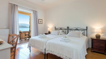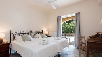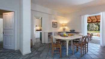 Umgeben von eleganten Zypressen-Türmen und alten Olivenbäumen, ist diese sehr mediterrane Villa im ungezwungenen Landhausstil eingerichtet. Dessen kühle Räume sind von Plattenfußböden und Holzbalkendecken eingerahmt. Riesige Terrassen aus weichem Stein umgeben einen sanft geschwungenen Infinity-Pool und umschließen das Haus zu einem eleganten Wohn- und Esszimmer im Freien, in dem die Meeresbrise eingefangen wird, Schatten spendend bedeckt ist und komplett mit Marmor-Esstisch ausgestattet ist. Dessen schlichte und ultra-entspannende Haus verfügt über eine gut ausgestattete Küche und ein fröhliches Wohnzimmer und fünf Schlafzimmer, jedes mit Klimaanlage und Deckenventilator. Für wirklich entspannte Tage kann vor Ort ein Kochservice arrangiert werden, und die Taverne von Kouloura ist 10 Minuten zu Fuß von der Villa entfernt. Mit Blick durch die Bäume auf das glitzernde Meer bietet dieses Hideaway einen privaten Fußweg durch die Olivenhaine, der sich am Eukalyptus-schattenden Strand unterhalb befindet. Kouloura liegt zwischen zwei größeren Buchten und ist nur 1 km von Wassersportmöglichkeiten und dem mit der Blauen Flagge ausgezeichneten Strand von Kalami entfernt. Des Nachtleben von Kassiopi ist nur 7 km entfernt.