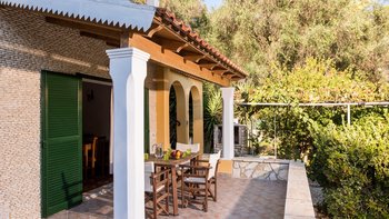 Perfekt gelegen und immer beliebt, führt in dieser Familienvilla auf Korfu ein Pergola-Schattenweg zum Gartentor, das sich direkt zum glitzernden Kieselstrand von Kerasia öffnet.