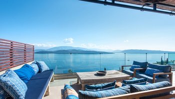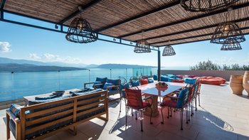 In der perfekten Lage zwischen St. Stephano und Kerasia bietet die Villa Kyvos einen atemberaubenden Blick auf das Meer, eine coole, moderne Inneneinrichtung und eine Dachterrasse mit Panoramablick, ideal für Unterhaltung mit Familie und Freunden.