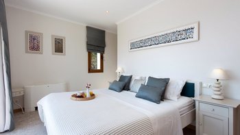 Im Inneren wurde die Villa sorgfältig renoviert und in raffinierten Cremes, Grau- und Blautönen neu eingerichtet. Dessen kühle Farbpalette ergänzt das moderne Styling und den luftigen offenen Wohnbereich, der eine neue, geräumige, moderne Küche, Ess- und Sitzbereiche umfasst. Ebenfalls im Erdgeschoss befinden sich ein Doppelschlafzimmer mit neuem, ebenerdigem Duschbad und ein Zweibettschlafzimmer mit eigenem, ebenerdigem Duschbad (ebenfalls mit einer Tür, die zum Poolbereich führt). Im Obergeschoss öffnet sich das Hauptschlafzimmer zu einer großen Terrasse mit Sitzbereich und Blick auf das Meer und St. Stephano, und das neue Bad umfasst eine ebenerdige Dusche und ein eigenes und separates Bad. Wassersport, Nachtleben und Restaurants sind in den nahe gelegenen Dörfern leicht zu erreichen.