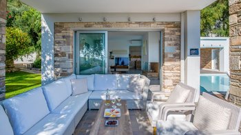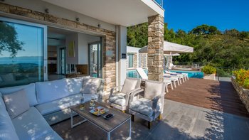 In einer zeitlosen Landschaft aus hohen Zypressen, verwinkelten Oliven und anmutigen Eukalyptusbäumen strahlt diese eindrucksvolle Villa Stil und Qualität aus und prägt ihre klassische korfiotische Umgebung sehr modern. Draußen rahmen die Steinmauern riesige Glasschiebetüren ein, die einen beeindruckenden Freiform-Infinity-Pool mit herrlichem Blick auf die Bucht von St. Stephano bieten. Der Pool mit seinen sanft abfallenden, seichen Wade-in-Tiefen wird von einem gemahlenen Holz-Sonnendeck umgeben, das durch ein schattiges, stilvolles „Wohnzimmer“ im Freien ergänzt wird.