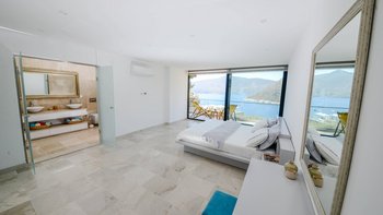 Diese Villa mit fünf Schlafzimmern bietet komfortable und geräumige Unterkünfte in bester Lage in der Nähe des Kalamar Beach Clubs, einem der beliebtesten Orte auf Kalkan. Helle, luftige Innenräume und ein außergewöhnlicher Meerblick schaffen einladende Wohnräume, ideal für Gruppen von Freunden oder Großfamilien.