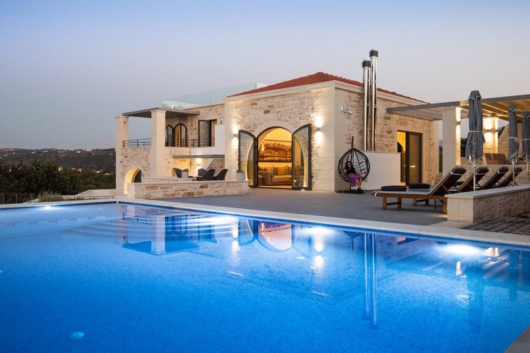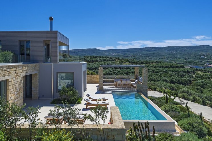 Eine elegante und moderne Steinvilla mit Meerblick, auf einem Hügel in der Nähe der Strände und hübschen Dörfern im Nordwesten Kretas.