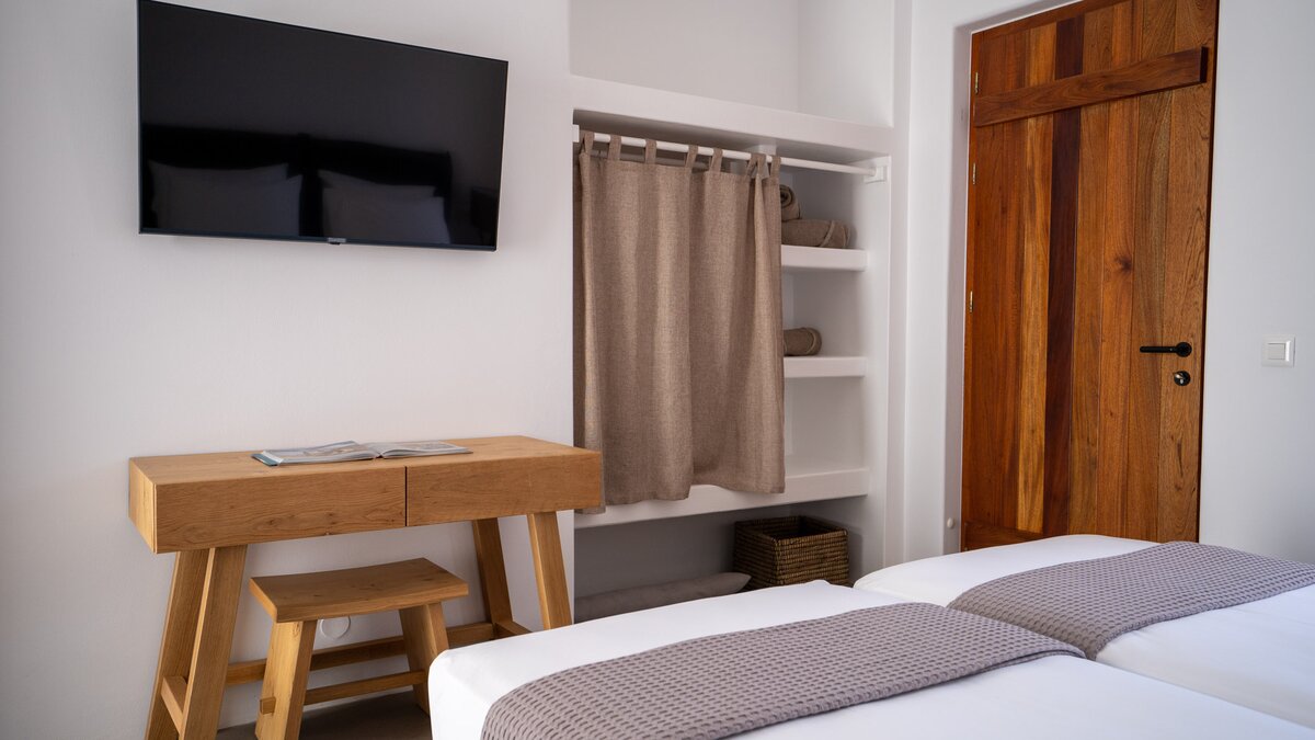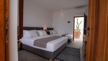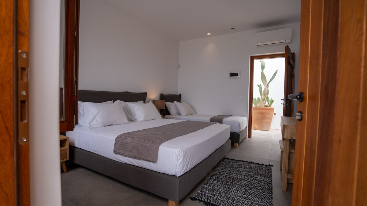 • Nebeneinander liegende Zimmer: ein Doppel- und ein Dreibettzimmer (mit drei Einzelbetten), mit Bad en Suite mit Zugang zur Poolterrasse