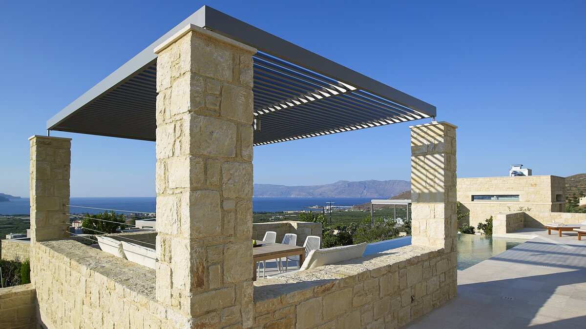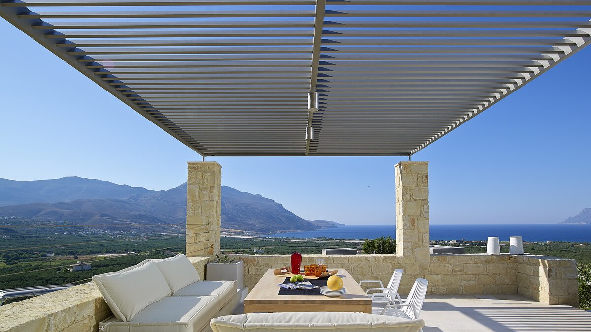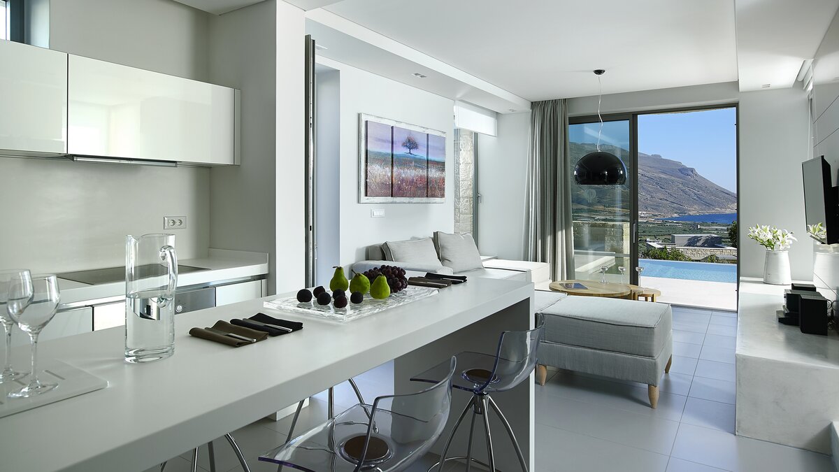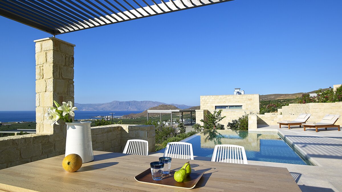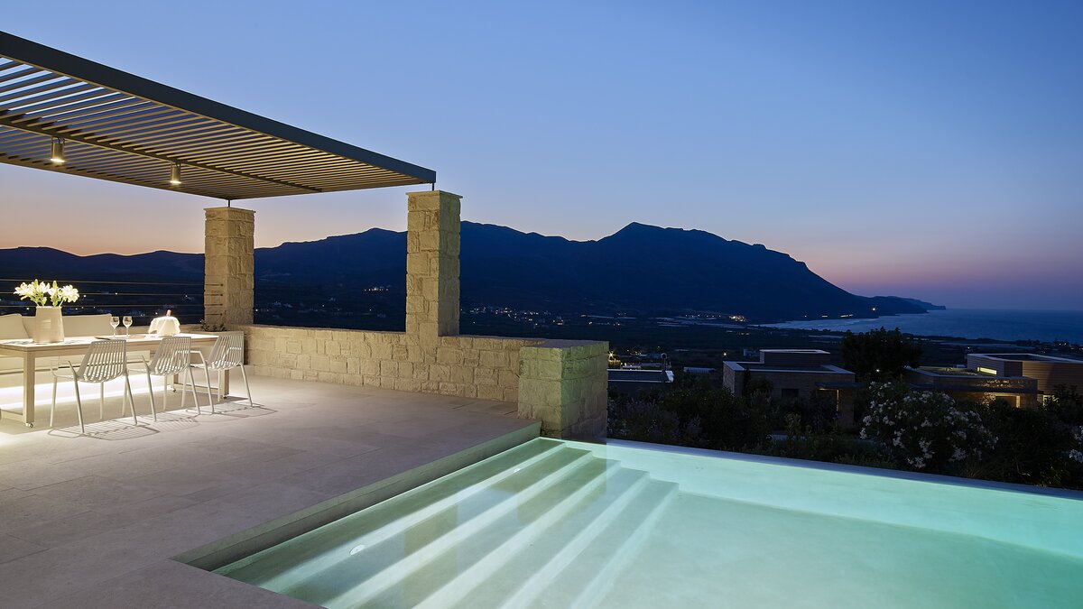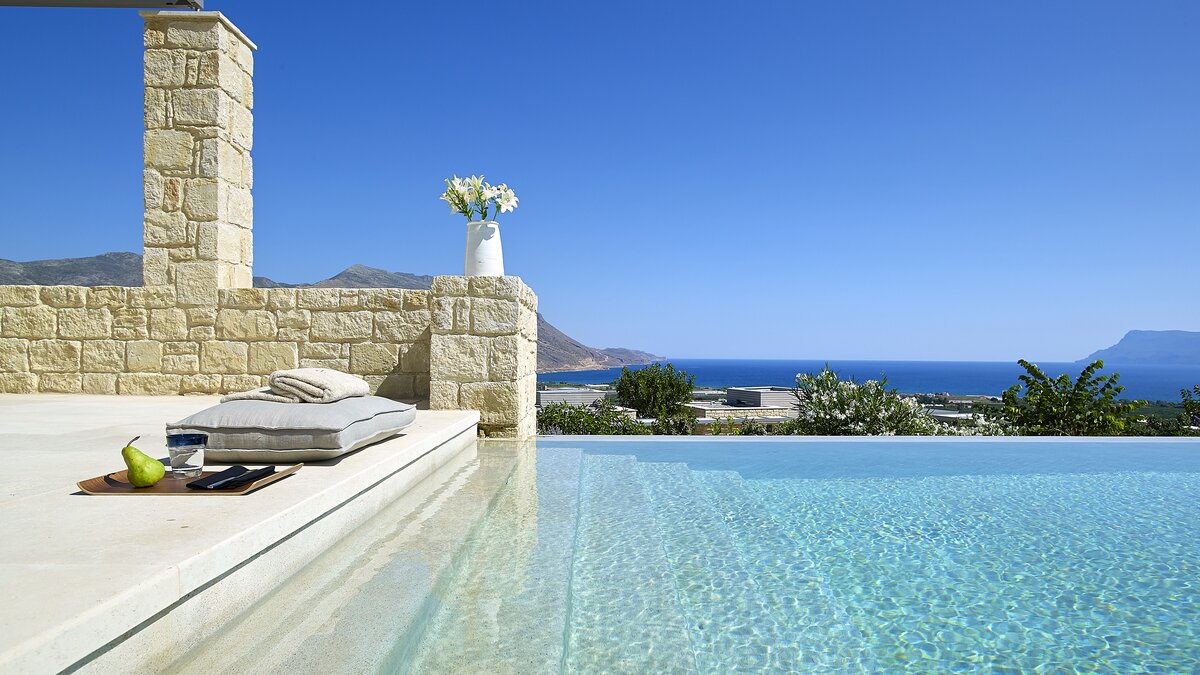Die Villa Royal ist ein modernes Refugium in Hanglage mit herrlichem Meerblick und bietet eine ruhige Abgeschiedenheit und einfachen Zugang zu den Stränden und der zerklüfteten Küste im Westen Kretas.