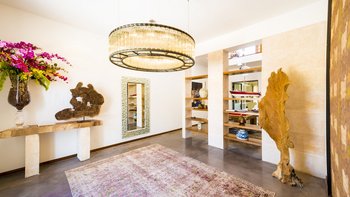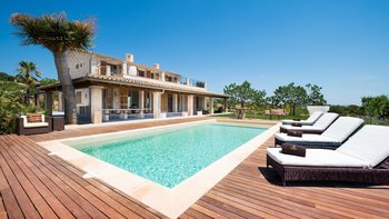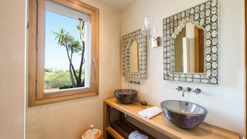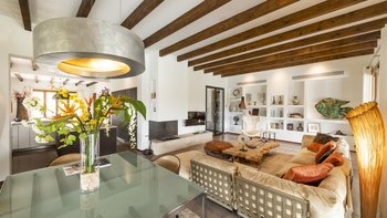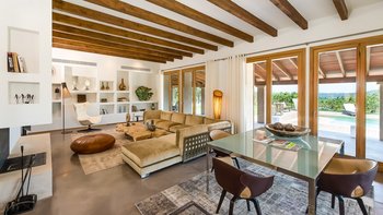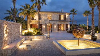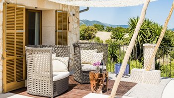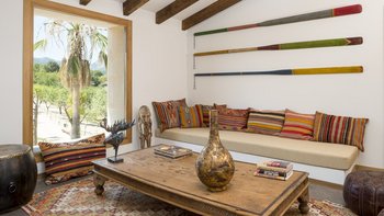 Ca’n Llorenc liegt im Herzen Mallorcas, zwischen den malerischen Städten Selva und Moscari. Es ist eine von zwei privaten Villen inmitten eines 20 Hektar großen mediterranen Gartens und bietet einen atemberaubenden Blick auf die Bucht von Alcudia und das Tramuntana-Gebirge. Dessen Villa ist mit einer Mischung aus handverlesenen Einzelstücken, Kunstwerken aus der ganzen Welt und modernem Komfort eingerichtet. Im Erdgeschoss befindet sich ein Billardtisch, der sich zum Wohnzimmer hin öffnet, und es gibt auch eine Tischtennisplatte sowie einen gemeinsamen Tennisplatz, was diese Immobilie ideal für Familien macht. Es gibt fünf Zweibettschlafzimmer mit eigenem Bad, eines im Erdgeschoss und eines an jeder Ecke der oberen Ebene. Dessen Schlafzimmer im Erdgeschoss führt zum Poolbereich und zu den Gärten und. Der Küchen-/Essbereich ist komplett mit einer Bulthaup-Küche ausgestattet und führt auf eine überdachte Terrasse, auf der Sie im Freien speisen können. Auf der oberen Ebene, neben den vier Schlafzimmern, gibt es einen offenen Wohnbereich, der auf eine Terrasse mit spektakulärer Aussicht führt. Dessen Villa liegt in der Nähe vieler Sehenswürdigkeiten der Insel, darunter Strände, Wanderwege und Radwege.