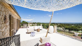 Diese moderne und schön gestaltete Villa bietet einen herrlichen Blick über das Herz von Mallorca bis zum Meer, sowie einen gemeinsamen Tennisplatz und Tischtennis für die Aktiveren.
