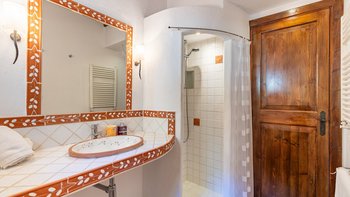 • Eine Treppe führt hinauf in das Haupt-Doppelzimmer (Super-Kingsize) mit Zugang zur Terrasse und mit Bad en suite
