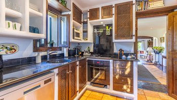 Diese charmante Villa liegt versteckt in einer unberührten Landschaft an der Spitze eines abfallenden Gartens, wo Lavendelbänke die Luft säumen und die Wege hinunter zum Infinity-Pool säumen. Ein Sonnenschirm auf der gepflasterten Poolterrasse beschattet einen hübschen Tisch, der perfekt zum Sonnenuntergang platziert ist, während eine schöne Terrasse höher im Garten durch einen kleinen Obstgarten auf den Pool und die Bergkulisse blickt. Innerhalb des einladenden und komfortabel eingerichteten Hauses schließt sich ein kombiniertes Wohn-/Esszimmer an eine kompakte, aber gut ausgestattete Küche an. Dessen- und Treppenhaus führt direkt in das gemütliche Hauptschlafzimmer mit eigenem Bad und einem möblierten und Panorama-Balkon. Die anderen beiden Schlafzimmer befinden sich in einem Schlafzimmerflügel, nur ein paar Schritte vom Haupthaus entfernt, eine Aufteilung, die für zwei Paare geeignet ist, die zusammen Urlaub machen. Ein Paar kann auch nur das Haupthaus nehmen und der Schlafzimmerflügel wird geschlossen. Ca’n Puput fühlt sich sehr privat, aber es ist nur 1 km von Campanet entfernt, wo es Geschäfte und Restaurants, Höhlen und Tennisplätze gibt, und die Strände von Pollensa und Pollensa sind nur 15 Minuten Autofahrt entfernt. Einiger der besten Restaurants Mallorcas sind in Moscari und Caimari sehr leicht zu erreichen.