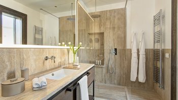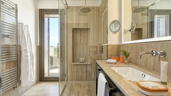 • Master-Doppelschlafzimmer (Super-Kingsize) mit Zugang zur Terrasse mit Bad, Badewanne und separater Dusche