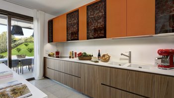Im Erdgeschoss, durch die Eingangshalle, werden die Gäste vom OFFENER GRUNDRISS Wohnzimmer mit Ess- und Küchenbereich begrüßt. Moderne Innenräume und Dekorationen wurden sorgfältig ausgewählt und platziert, um eine ruhige Atmosphäre zu schaffen. Dank der großen Fenstertüren, die um den Raum herum angeordnet sind, halten alle Bereiche Licht und bieten Zugang zur Außenterrasse, wodurch ein nahtloser Lebensstil im Innen- und Außenbereich entsteht.
