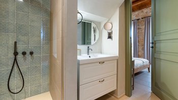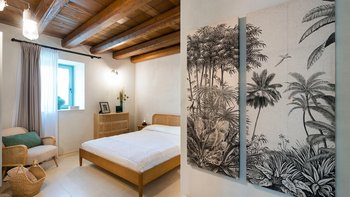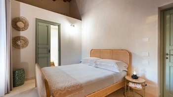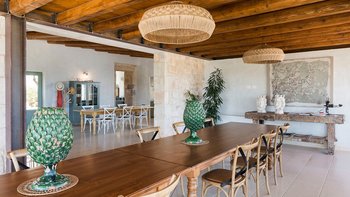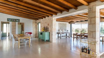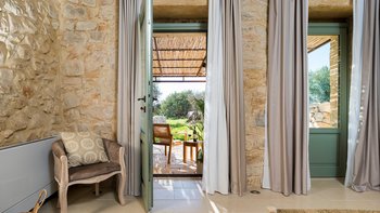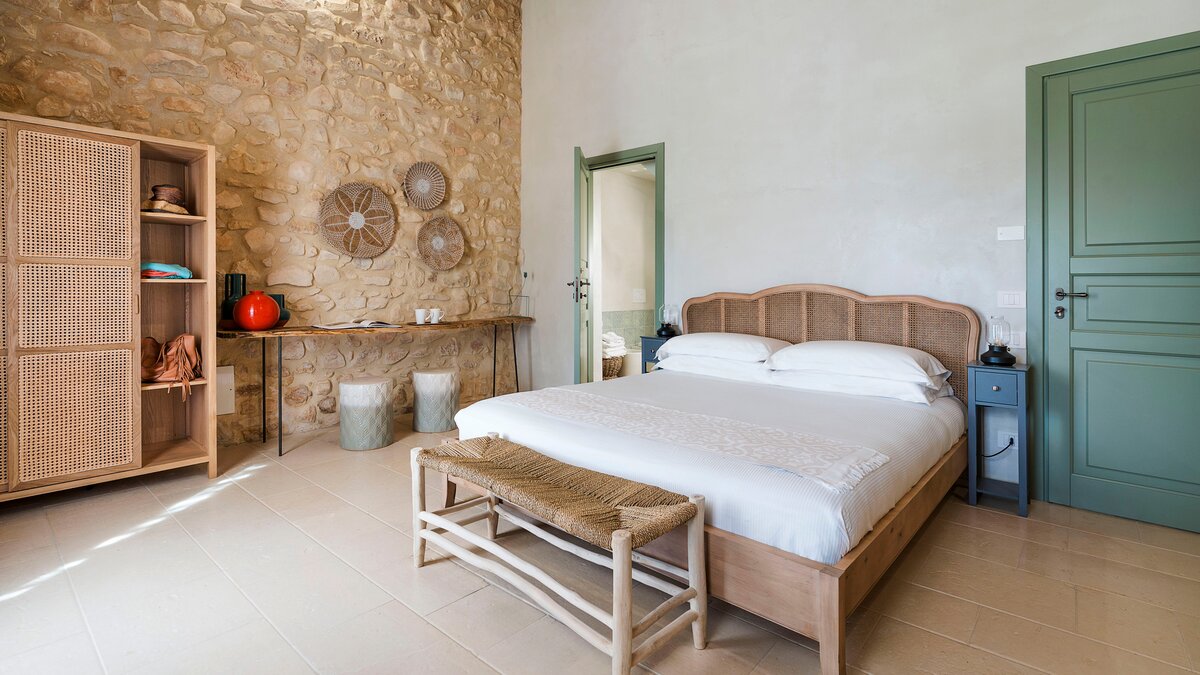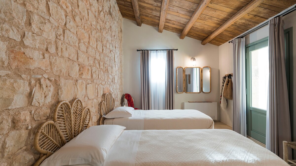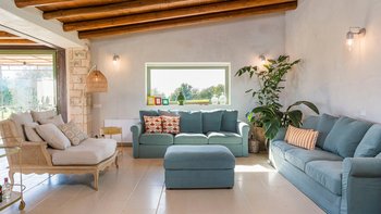 Im Inneren ist die Villa ruhig, luftig und lichtdurchflutet. Der Hauptwohnbereich ist offen und einladend, wo hohe Fenster die Aussicht rahmen und das Äußere hereinbringen. Natürliche Materialien und gedeckte Töne sind durchzogen und schaffen ein Gefühl von ruhiger Eleganz, das sowohl stilvoll und auch beruhigend ist. Des Hauses verfügt über sechs Schlafzimmer, jedes mit eigenem Bad, das Komfort und Privatsphäre für die gesamte Gruppe bietet. Zwei der Zimmer befinden sich in der Hauptvilla, drei sind von außen zugänglich, um zusätzliche Abgeschiedenheit zu gewährleisten, und ein letztes Schlafzimmer befindet sich im Obergeschoss mit herrlicher Aussicht. Eine gemütliche Lounge und eine schön eingerichtete Küche vervollständigen den Innenraum, ideal für ein einfaches Frühstück oder entspannte Abende.