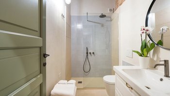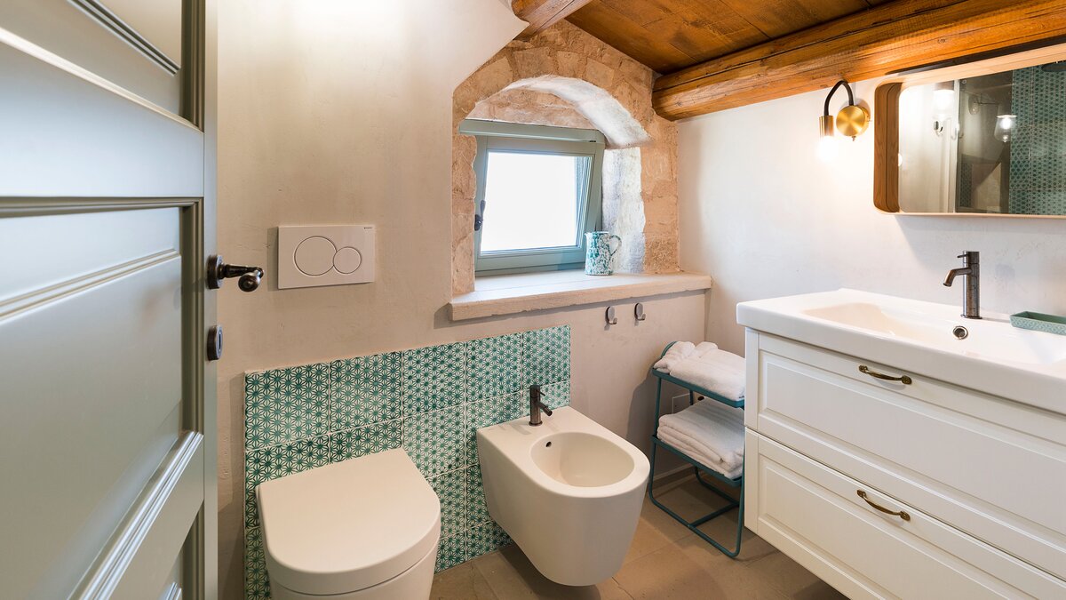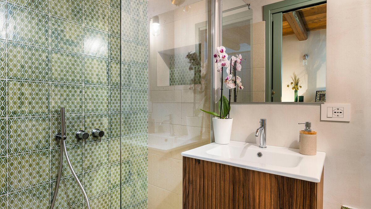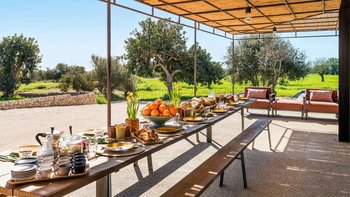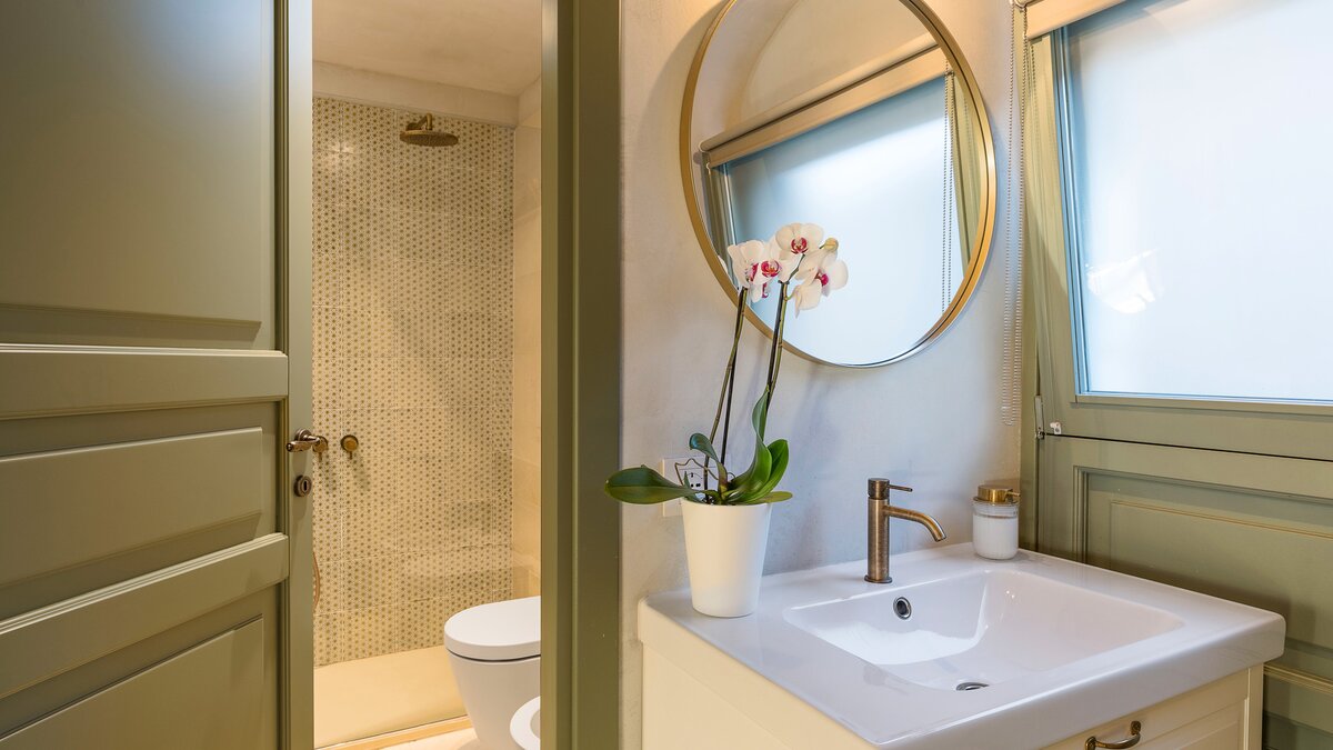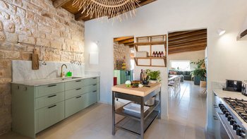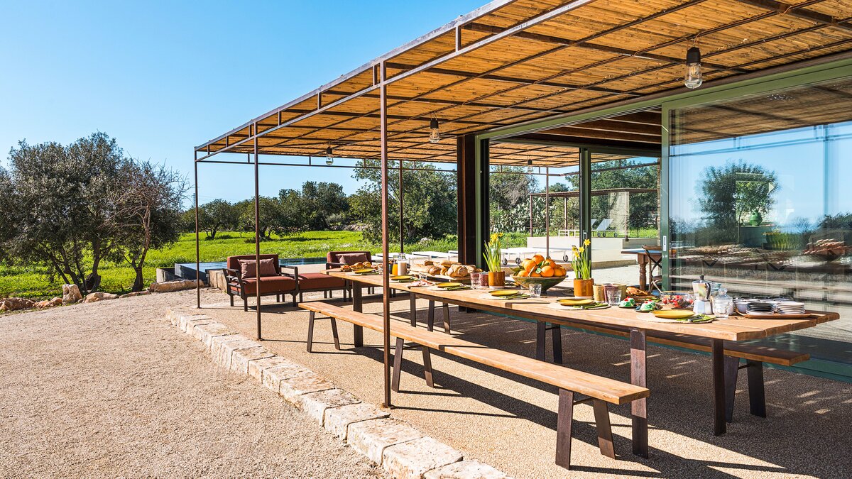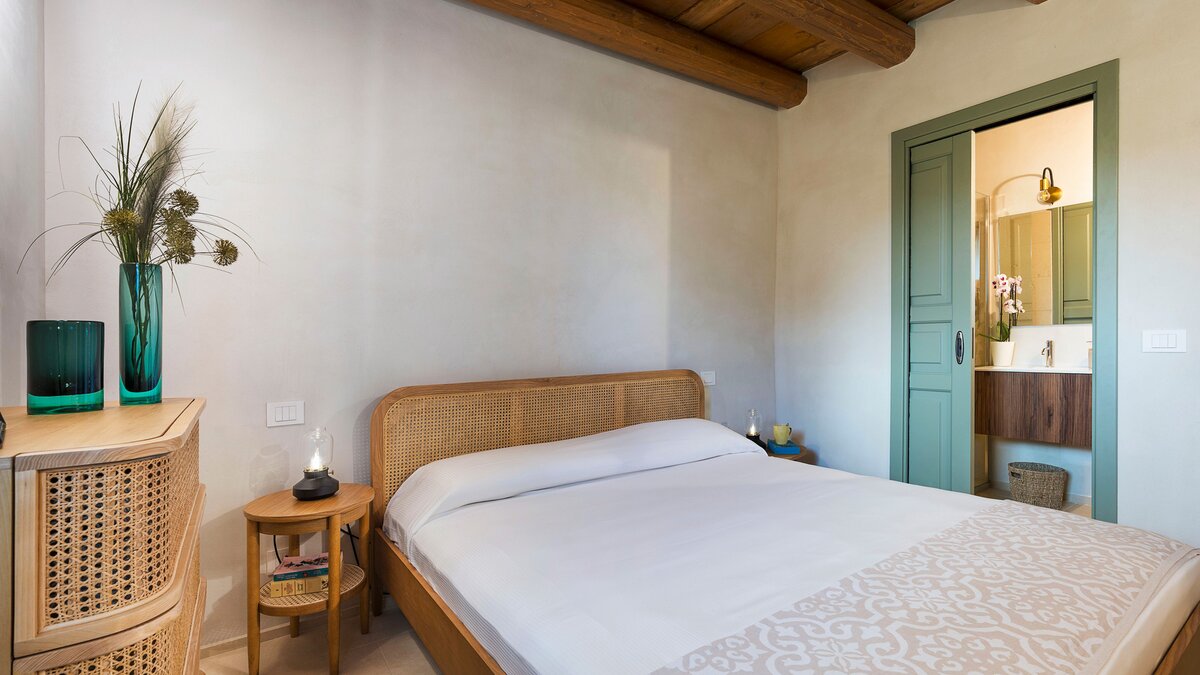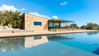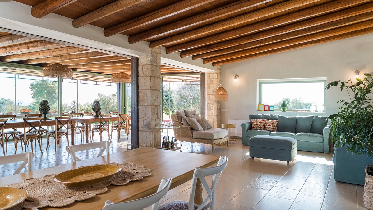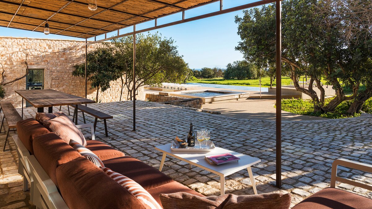 Draußen ist die Umgebung genauso besonders. Schattige Terrassen erstrecken sich entlang des Hauses und eignen sich perfekt für ein langsames, sonnenverwöhntes Mittag- oder Abendessen unter dem Sternenhimmel. Der Salzwasser-Pool glitzert in der Sonne, Liegestühle warten in der Nähe und ein Whirlpool befindet sich direkt daneben, um sich verwöhnen zu lassen. Dessen Landschaft erstreckt sich über sanfte Falten von Olivenbäumen und weite Ausblicke auf das Meer und schafft eine Kulisse natürlicher Schönheit und Ruhe.
