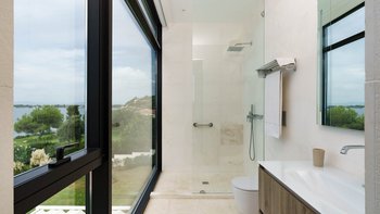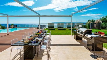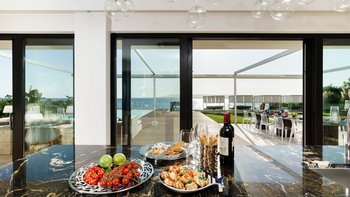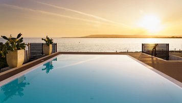 Die Aussicht (vor allem bei Sonnenuntergang) ist einfach atemberaubend in dieser erstklassigen Immobilie auf Sizilien, nur 10 km südlich des historischen Siracusa. Auf einem felsigen Vorgebirge auf der wunderschönen Halbinsel Maddalena steht die Lage direkt am Meer im Mittelpunkt. Riesige Glasfenster erobern das dreistöckige Haus und es gibt eine herrliche Menge Platz im Freien, um diese Aussicht wirklich zu genießen. Es gibt sogar einen Zugang zum Meer und zu den Felsen darunter. Gehe Sie zum eleganten beheizten Pool, um ein herrlich schönes Panorama zu genießen, und es gibt schöne Rasengärten und eine große Terrasse mit vielen Lounges und Essensbereichen und. Den ganzen Tag über ist es eine echte Sonnenfalle, aber das weitläufige Pooldeck mit den gemütlichen Rattansofas ist am besten, wenn der Sundowner rauskommt. Auch am Abend gibt es nichts Besseres, als ein herrliches Festmahl lokaler Spezialitäten vom Grill am riesigen Esstisch aus Granit zu genießen. Für alle Mahlzeiten, die tagsüber im Freien genossen werden, gibt es eine ausziehbare Markise, die während des heißen sizilianischen Wetters den nötigen Schatten spendet.