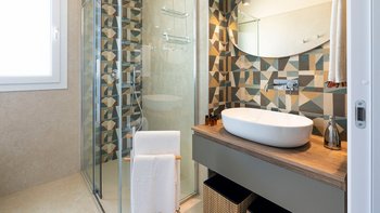 Im Inneren gibt es eine offene Grundriss Küche, einen Wohn- und Essbereich, die alle mit hohen Decken, modernen Möbeln, natürlichem Licht und Fenstertüren ausgestattet sind, die Zugang zum Außenbereich ermöglichen und einen nahtlosen Fluss von Innen zu Außenbereichen ermöglichen. Weiter unten gibt es zwei King-Size-Doppelzimmer, beide mit eigenem Duschbad, die alle den gleichen hohen Standard an Innenausstattung und Ausstattung wie der Rest der Villa aufweisen.