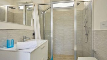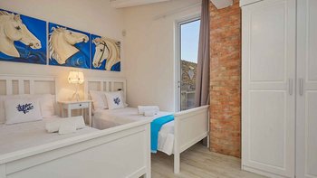 Im Haupthaus hat eines der Schlafzimmer im ersten Stock Zugang zu einer möblierten Terrasse und einem durchgehenden Glasfenster. Dieser Glasfenster bleibt verschlossen. Der zweite Schlafzimmer hat ein niedriges Fenster.
