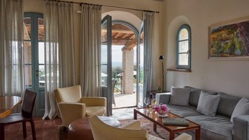 Eine der Villen in Borgo Pignano, La Cavallerizza, ist eine sehr komfortable Villa mit drei Schlafzimmern und einem schönen modernen Interieur, die einen unvergleichlichen Blick auf die Toskana bietet.