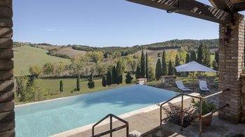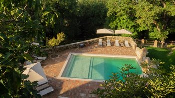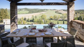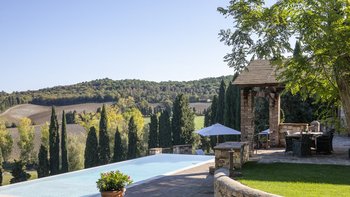 Betreten Sie die Villa durch das elegante offene Grundriss Wohnzimmer, den Essbereich und die voll ausgestattete Küche und genießen Sie das natürliche Licht, das anmutig von Raum zu Raum fließt. Denen beiden großen Hauptschlafzimmer, beide mit eigenem Bad, wurden sorgfältig entworfen, um allen Gästen jederzeit einen ruhigen und komfortablen Aufenthalt zu gewährleisten. Draußen bietet die teilweise überdachte Terrasse einen unvergleichlichen Blick auf die sanften Hügel der Toskana und ist ein idyllischer Ort, an dem die Gäste morgens, mittags oder abends vor einer beeindruckenden Kulisse speisen können. Stufen führen hinunter zum großen Infinity-Pool.