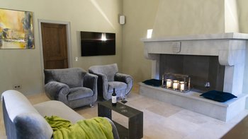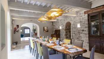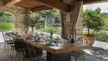Die Villa Fieravista liegt auf dem Gelände einer preisgekrönten Wein- und Olivenölfarm und ist eine eklektische Mischung aus traditioneller Architektur mit Steinmauern und beeindruckenden Gewölbedecken und schickem, zeitgenössischem Stil. Des geräumigen Wohnzimmer ist mit einem weichen, luxuriösen Ecksofa und einem offenen Kamin mit einem separaten hellen offenen Essbereich, mit einem Tisch für 10 Personen und mit einem eigenen Pizzaofen der Villa ausgestattet. Es gibt eine fantastische Profiküche aus Edelstahl, die sich zu einer schönen Frühstücksterrasse mit atemberaubender Aussicht und einem Gemüsegarten öffnet, von dem die Gäste sich selbst bedienen können.