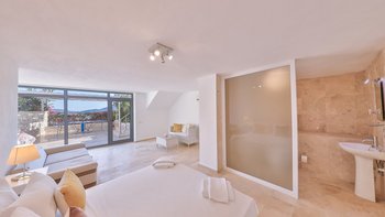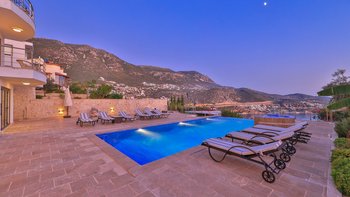 Im Haupthaus gibt es 4 Schlafzimmer mit eigenem Bad, die sich auf zwei Etagen split erstrecken und alle haben Zugang zum Balkon. Ein weiteres Schlafzimmer mit eigenem Bad befindet sich im Poolanbau, der über einen Wohnbereich und eine eigene Terrasse verfügt. Nahe gelegene Annehmlichkeiten sind in Kalkan leicht zu erreichen. Dessen Altstadt und der Hafen sind ca. 600 m entfernt.