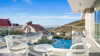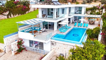 Villa Guler ist eine neu erbaute, moderne Villa in Kalkan, entworfen mit einem schönen Infinity-Pool und unvergleichlichem Blick auf das Meer.