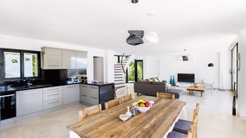 Der offene Wohn-, Ess- und Küchenbereich im Erdgeschoss führt durch Schiebetüren auf die Poolterrasse mit Bar und Steingrill. Tagsüber können Sie Erfrischungen und abends einen Sundowner genießen, während Sie den Blick auf das Meer und die Sonnenuntergänge am Pool genießen.