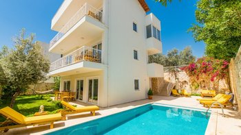 Die Villa Merkez ist ein großes, geräumiges Anwesen, das sich ideal für große Gruppen eignet, die eine Flucht in der Türkei suchen. Deren Villa ist in drei Wohnungen Split und bietet die perfekte Kombination aus Nähe und Privatsphäre. Jedes Apartment ist modern, hell und luftig. Des Apartment im Erdgeschoss verfügt über einen geräumigen Wohn-, Ess- und Küchenbereich sowie zwei Doppelschlafzimmer, die entweder zum Garten oder zu einer privaten Terrasse führen. Deren zweites Apartment befindet sich auf Straßenniveau und hat einen fast identischen Grundriss, nur dass die beiden Doppelschlafzimmer Zugang zu einem Balkon haben. Deren Apartment in der obersten Etage verfügt über eine ähnlich einladende Küche, ein Wohnzimmer und einen Essbereich. Es gibt drei Doppelschlafzimmer mit Bad, zwei mit Zugang zu einem Balkon und das dritte zur sonnenverwöhnten Dachterrasse. Dies ist der beste Ort, um die Sonne und die Aussicht von Kalkan zu genießen, komplett mit Liegestühlen und einem Tauchbecken. Es gibt auch einen privaten Pool im Garten.