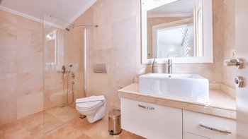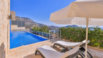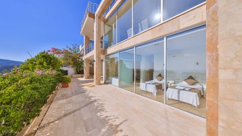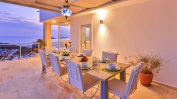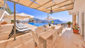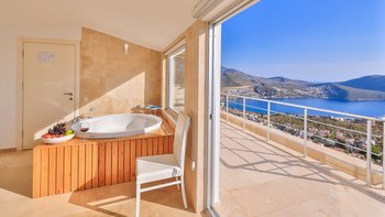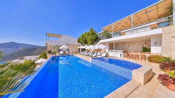 Die Außenbereiche sind wirklich fesselnd. Der Infinity-Pool mit Wasserfall-Funktion bildet einen atemberaubenden Blickpunkt, umgeben von bequemen Sonnenliegen. Ein separates Kinderbecken sorgt dafür, dass die jüngeren Gäste am Spaß teilnehmen können. Der Außenbar und der Sitzbereich sind perfekt, um am Abend einen Drink zu genießen, während Sie den Sonnenuntergang beobachten, und auch im Freien können Sie speisen. Mit mehreren Terrassen zur Auswahl, darunter ein Whirlpool im Freien und ein traditioneller türkischer Köşk zum Faulenzen, gibt es keinen Mangel an Orten zum Entspannen. Und da die charmante Altstadt von Kalkan nur einen kurzen Spaziergang entfernt ist, haben Sie einfachen Zugang zu lokalen Geschäften und Restaurants, während Sie die Privatsphäre Ihrer eigenen Villa genießen.