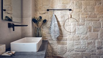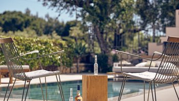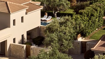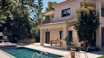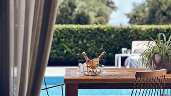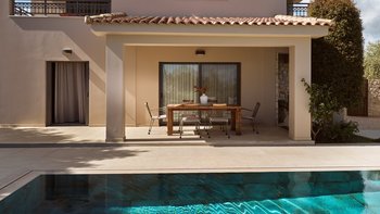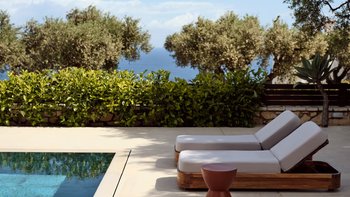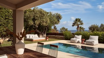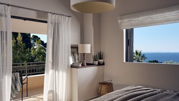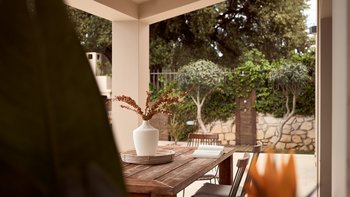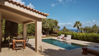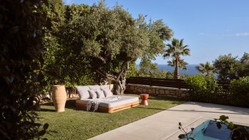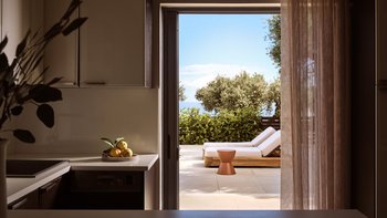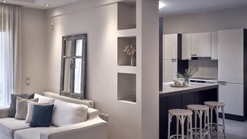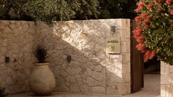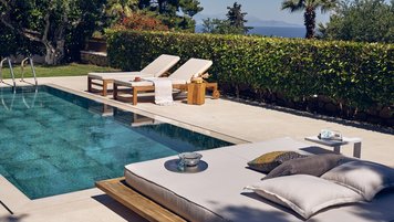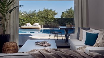 Beruhigende Grautöne beruhigen die Seele in dieser modernen 6-Personen-Villa in der Nähe von Zakynthos Stadt.