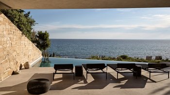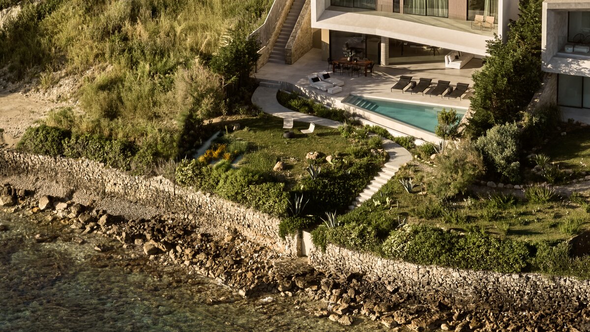 Im Freien steht der Infinity-Pool im Mittelpunkt, flankiert von Liegen und Sonnenschirmen für entspannte Nachmittage. Ein schattiger Essbereich mit eingebautem Gasgrill lädt zu langen, gemütlichen Mahlzeiten mit Blick auf das Wasser ein. Von der Terrasse aus führt ein Weg direkt zum Meer, wo Sie morgens ein erfrischendes Bad nehmen oder nachmittags in der Sonne verbringen können.