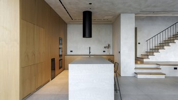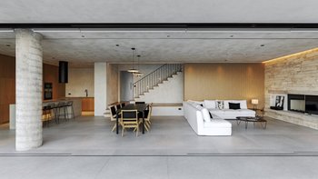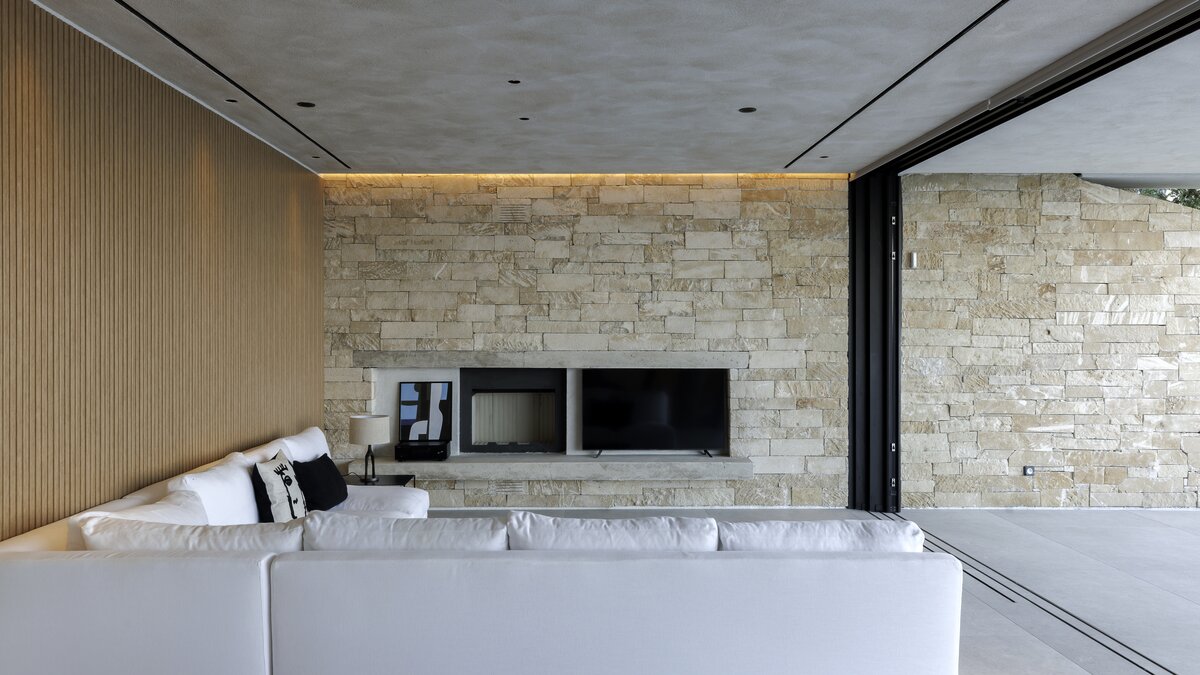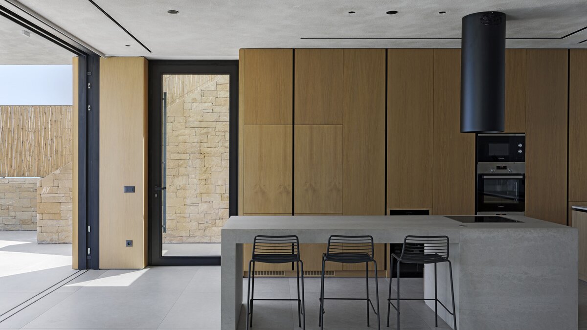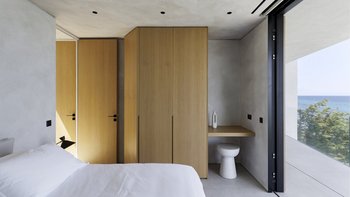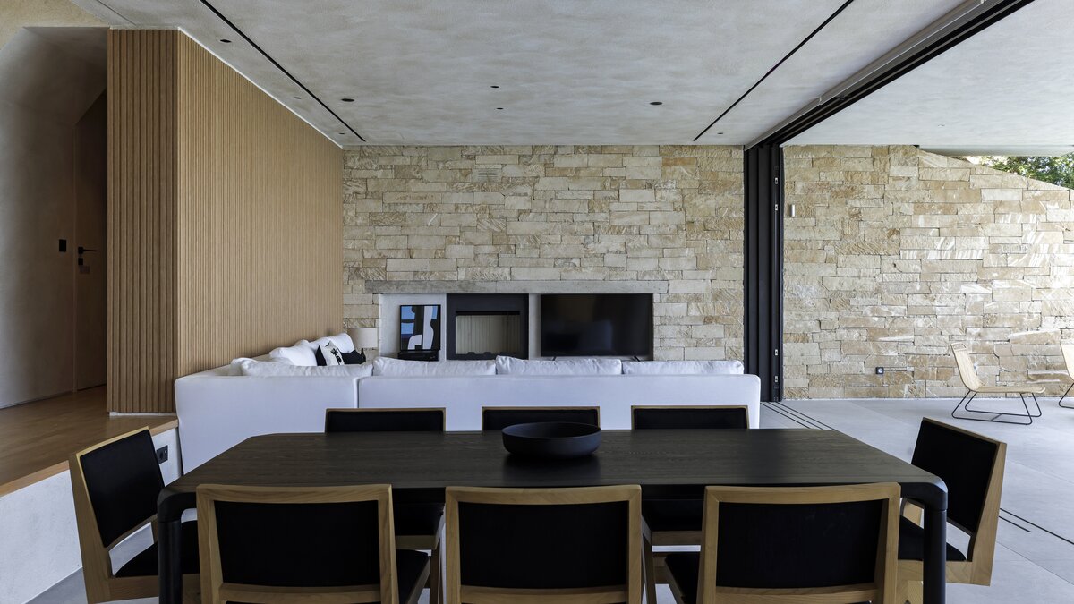 Im Inneren befindet sich das Hauptgeschoss der Villa in einem lichtdurchfluteten Raum mit einem offenen Wohn- und Essbereich, der von raumhohen Fenstern eingerahmt wird, die direkt auf die Terrasse und den Infinity-Pool führen. Eine voll ausgestattete Küche mit zwei Öfen, zwei Kühlschränken und einer Kaffeemaschine macht die Selbstverpflegung mühelos, während eine Garderobe den Gästen zusätzlichen Komfort bietet.