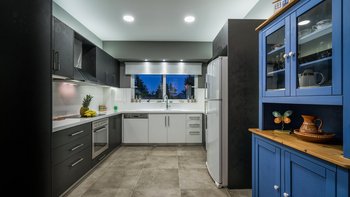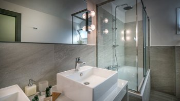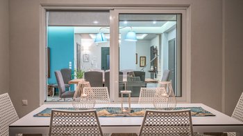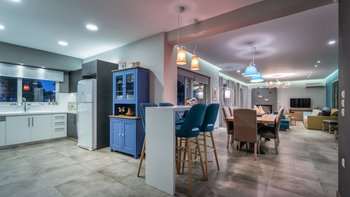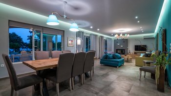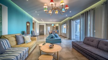 Die gewölbte überdachte Terrasse führt zum geräumigen Wohnbereich der Villa, der den größten Teil des Erdgeschosses einnimmt. Es gibt einen modernen, wenn auch skurrilen Stil – schöne Farbelemente erwecken den Wohnbereich zum Leben, und es gibt viele bequeme Sitzgelegenheiten für gemütliche Nächte in der Villa. Der Sitzbereich führt zum Esstisch im Innenbereich, sodass Sie wählen können, ob Sie drinnen essen oder auf den angrenzenden Terrassentisch gehen möchten. Direkt am Ende der Etage befindet sich die moderne Küche. Es gibt eine Frühstücksbar und alle modernen Kücheneinrichtungen, die diesen Aufenthalt zu einem sehr komfortablen Aufenthalt machen. Im zweistöckigen Design der Villa befinden sich vier geräumige Schlafzimmer – eines mit Doppelbett im Erdgeschoss und weitere drei im ersten Stock. Während alle Zimmer einen anderen Stil haben, verfügt jedes über ein großzügiges, modernes Bad und ein unglaublich bequemes Doppelbett. Denen Zimmer im ersten Stock haben auch den Luxus, auf eine große private Terrasse mit fantastischem Blick auf die Bucht zu führen.