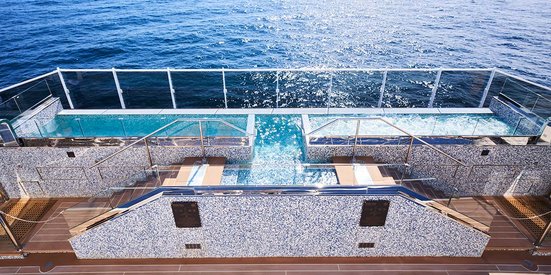 Jedes Deck überrascht mit weitläufigen Bereichen: Der Infinity Pool im hinteren Bereichauf Deck 5 gibt mir wahrlich das Gefühl, ich schwimme in die Unendlichkeit des Meeres hinaus. Auf den Sonnenbetten lässt sich gut die Seele baumeln. Ein paar Decks höher überrascht der Atoll Pool mit einem weiteren Poolbereich und auf Deck 12 befinden sich kleine Geheimplätze wie die seitlichen Whirlpools. Der Helios Pool im vorderen Bereich ist nur für Erwachsene zugänglich.