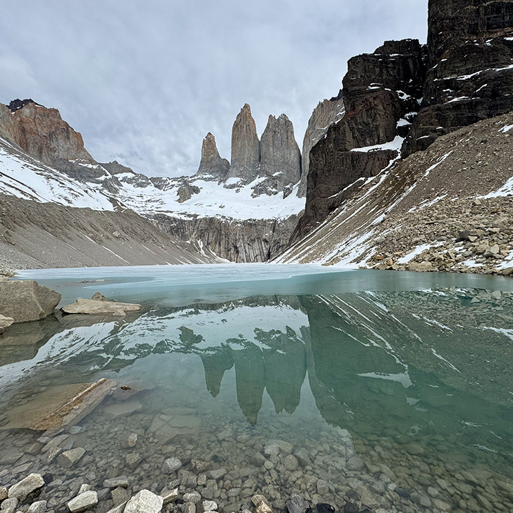 Oben angekommen, werden wir mit einem der magischsten Anblicke Patagoniens belohnt: einem halb zugefrorenen, türkisfarbenen Gletschersee, über dem die drei mächtigen Türme thronen. Am Ufer entdecken wir sogar ihre Spiegelung im stillen Wasser – ein Moment, der uns tief berührt und lange in Erinnerung bleibt.